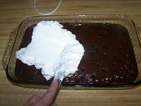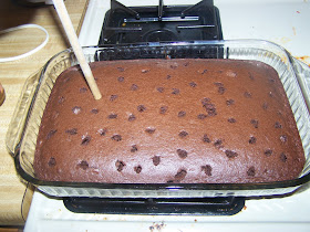 Open your jar of caramel topping and pour it all over the cake, making sure it gets in all the holes as well. It is important to do this as soon as it comes out of the oven while the cake is still hot so the caramel will melt into the cake.