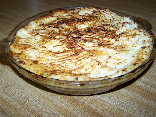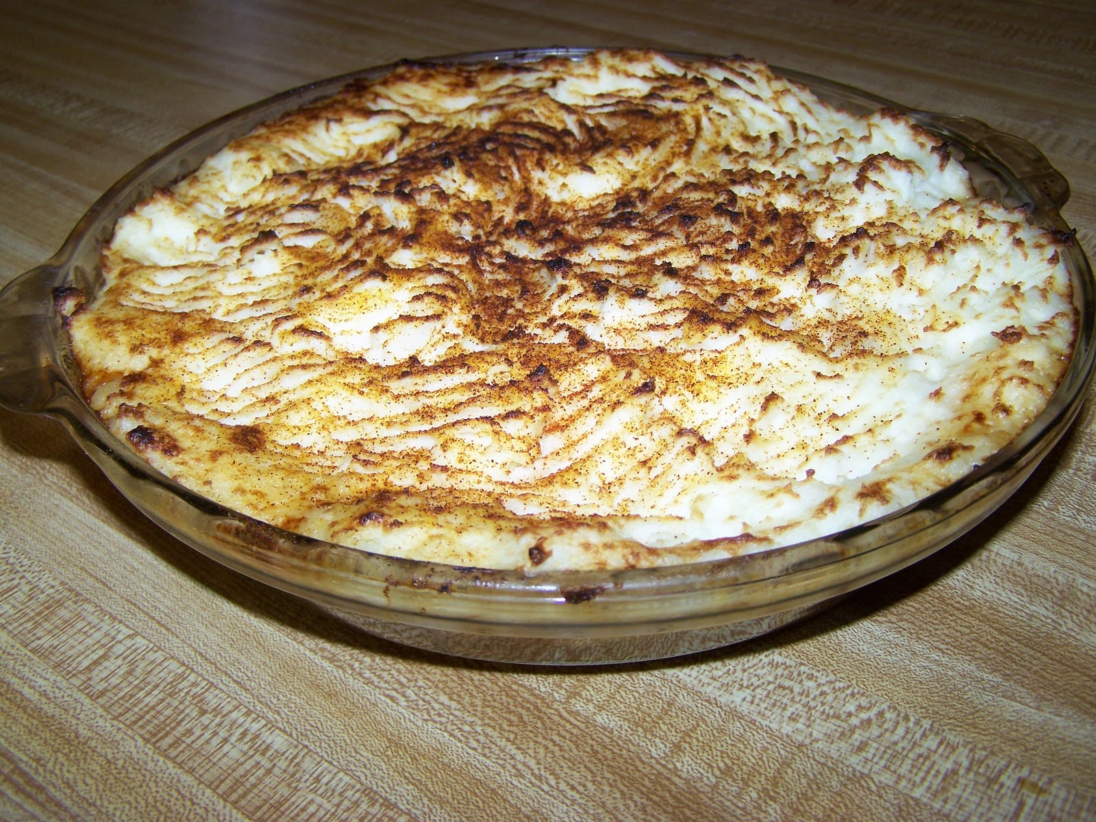 Spoon your meat and vegetable mixture into a pie pan or casserole dish, top with your mashed potatoes, using a fork to rough up the top which will give you a lot of nice browned places. Sprinkle with paprika and place under broiler on high about 10 minutes or until the potatoes are nice and browned.