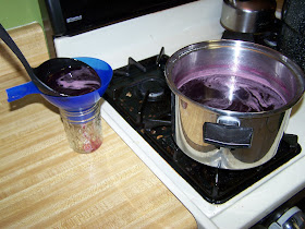 Remember how I said I made up the juice in advance and the crop was a little light this year? Well, turns out when I went to make the jelly, I was one cup short of the juice I needed so I sent hubby to the store to buy some grapes so I could make up some more juice. While making the juice from the store bought grapes, I realized that, frankly, it smelled like crap. It is no wonder store bought grape jelly doesn't taste very good, the store bought grapes don't taste very good! Thankfully, since it was only one cup of juice, it didn't affect the end result. I followed the instructions from a box of Sure Jell with one tiny exception. When I crush my grapes, I add a cup and a half of water, regardless of how many grapes there are so, in other years with a heavy crop, I end up with a juice that is much more concentrated.