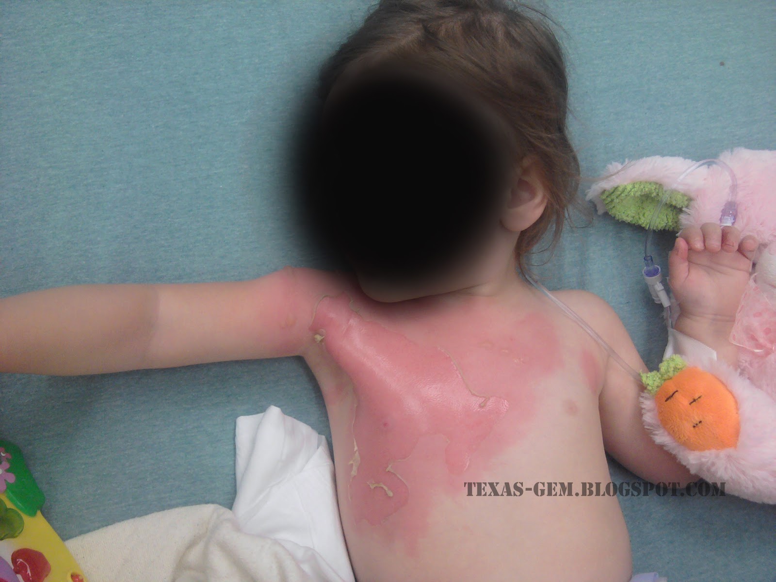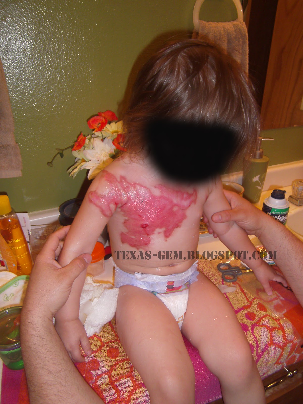 In 2011, my Monster, who had recently turned 2, pulled a bowl of stew off the counter onto herself right in front of me. I couldn't stop her. It was like a horror movie taking place right before my eyes. I had just ladled the boiling stew into bowls and pushed them to the back of the counter where (I thought) my kids couldn't reach them to cool off. While they were cooling, I started unloading the dryer a few feet away. I saw my Monster approach the bowls, told her to stay away because it was hot, saw her reach for it, started towards her but was not fast enough. In the blink of an eye, she had pulled a bowl of stew off the counter onto herself. I instantly pulled her clothes off and a layer of skin came with it. I rushed to the bathroom and turned the cold water on, putting her into the tub where she immediately laid down on her stomach in the cold water, trying to stop the pain. As I wrapped her in a towel and started rushing towards the phone to call Mr. Gem, he pulled up. I yelled at him to put her car seat in his car. Within minutes he had her in the car and he was racing for the hospital, which is about 30 minutes away. He made it in 8 minutes. I turned off the appliances so the house wouldn't burn down, loaded up my Monkey, called my parents and started towards their house to drop off Monkey so I could go to the ER.
