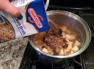 Now we are going to take this tasty mixture from heaven and add it to our waiting potatoes. Add chicken broth...