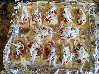 Lay your club crackers out single file on a baking sheet. Spoon a small amount of pizza/marinara sauce on each cracker.