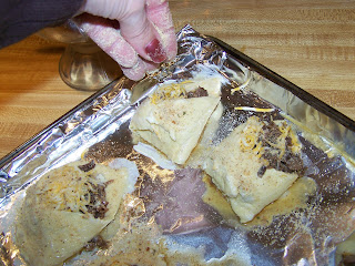 Brush with some melted butter, don't worry about keeping it just on the crescent roll part, it is perfectly fine if it gets on the filling as well.