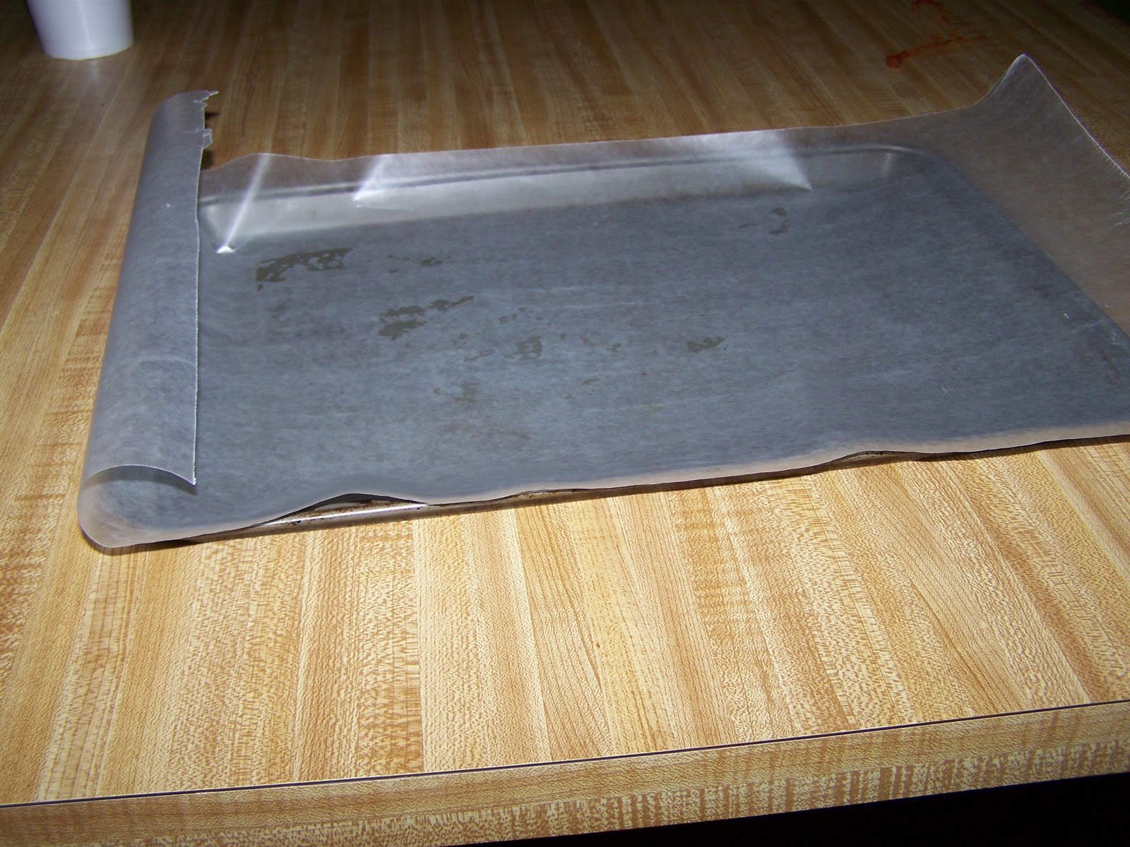 The first step is to take a sheet of wax paper and put it on a cookie sheet.