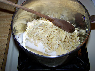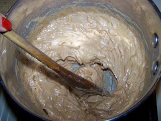 Turn the heat on high and begin stirring. This is the only "hard" part, you have to stir it constantly. I timed it and it takes roughly 15 minutes on my stove before the toffee is ready. The next few pictures will show the changes in color and texture that the toffee goes through until it is ready.