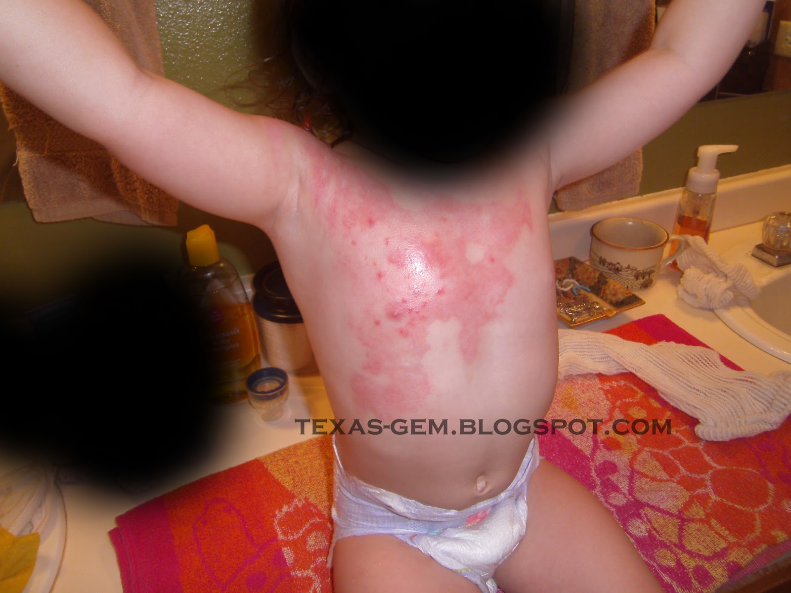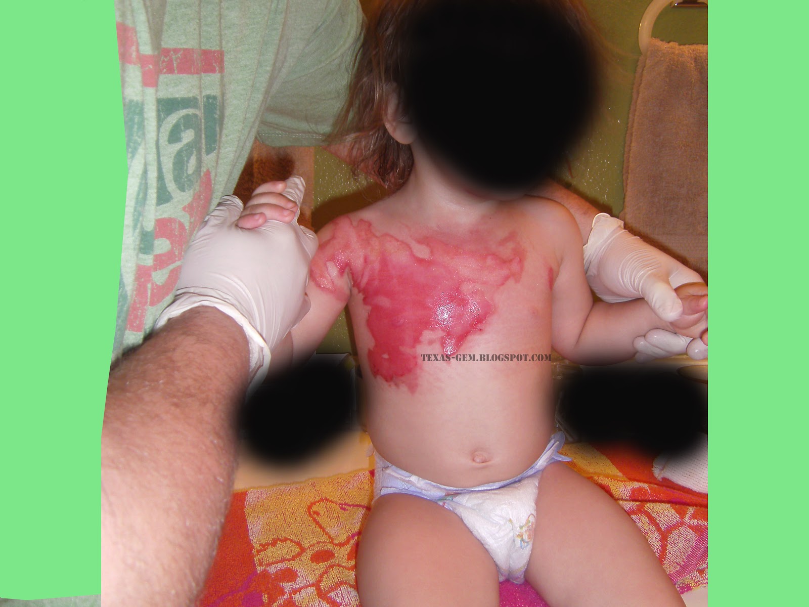 In 2011, my Monster, who had recently turned 2, pulled a bowl of stew off the counter onto herself right in front of me. I couldn't stop her. It was like a horror movie taking place right before my eyes. I had just ladled the boiling stew into bowls and pushed them to the back of the counter where (I thought) my kids couldn't reach them to cool off. While they were cooling, I started unloading the dryer a few feet away. I saw my Monster approach the bowls, told her to stay away because it was hot, saw her reach for it, started towards her but was not fast enough. In the blink of an eye, she had pulled a bowl of stew off the counter onto herself. I instantly pulled her clothes off and a layer of skin came with it. I rushed to the bathroom and turned the cold water on, putting her into the tub where she immediately laid down on her stomach in the cold water, trying to stop the pain. As I wrapped her in a towel and started rushing towards the phone to call Mr. Gem, he pulled up. I yelled at him to put her car seat in his car. Within minutes he had her in the car and he was racing for the hospital, which is about 30 minutes away. He made it in 8 minutes. I turned off the appliances so the house wouldn't burn down, loaded up my Monkey, called my parents and started towards their house to drop off Monkey so I could go to the ER.